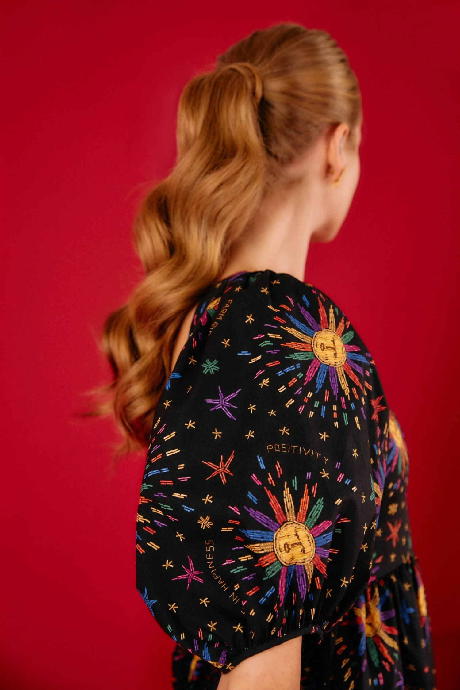 Bring the colorful sun out, whatever the weather! The Rainbow Suns Organic Cotton Maxi Dress is here to embrace you without losing comfort with its cozy fit, square neck, and smocked back bodice. How about inviting warm tights and bold FARM Rio clogs and boots to hang out with you and your new dress? Then you can keep coloring your days in a Fall-friendly way <3